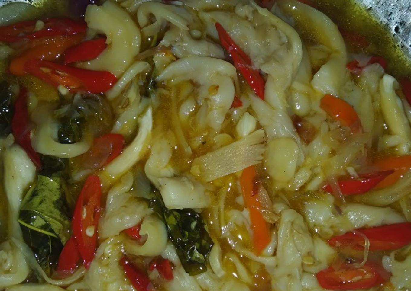 - 2 bgks jamur tiram - 3 sg bawang merah - 3 sg bawang putih - 2 bh cabe setan - 4 bh cabe merah keriting - 1 sdm saus saori - 1 lmbr daun salam - Minyak goreng - Garam - Lada - Royco
