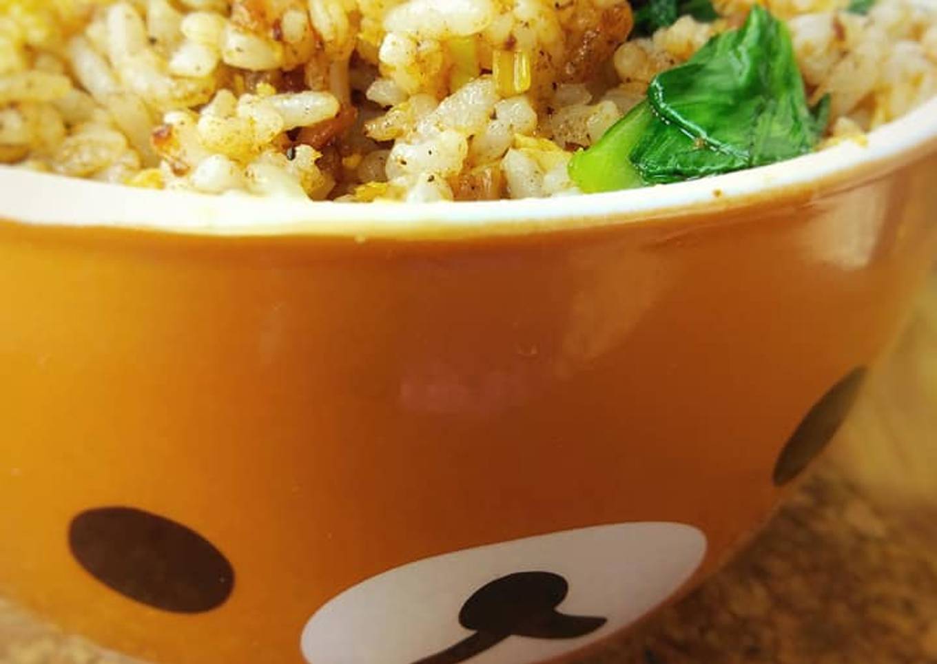 - 2 piring nasi putih - 2 butir telur ayam, kocok lepas - 1/2 cup sisa bumbu rendang - 2 siung bawang putih - 1 buah daun bawang, potong sesuai selera - 2 batang pokcoy, potong sesuai selera 3 - 1 sdt garam - 1/2 sdt merica bubuk