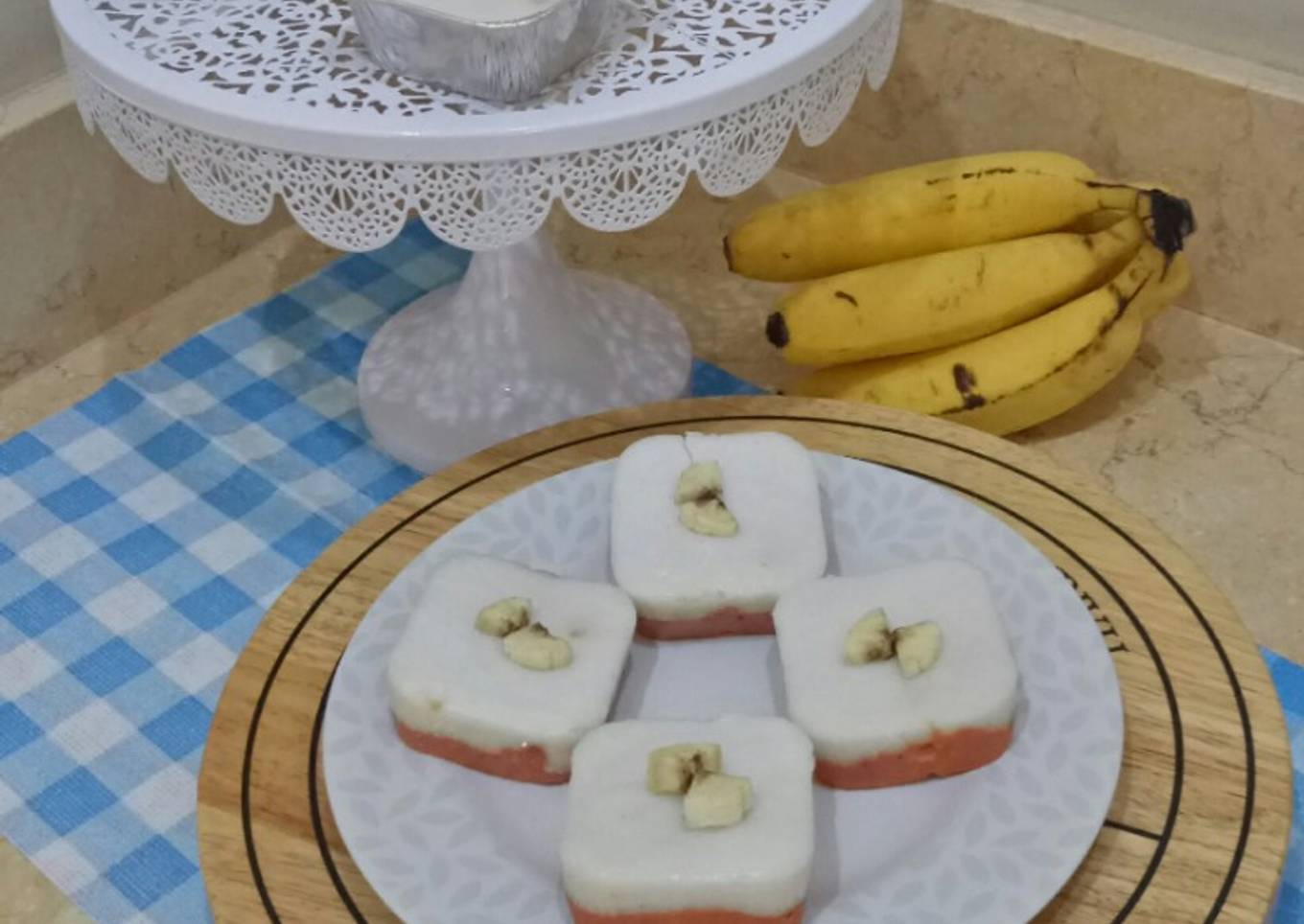 - 150 gr tepung beras - 400 ml santan - 80 gr gula pasir - 15 gr pisang - 1/2 sdt pasta pisang - 50 gr tepung beras - 200 ml santan - 1/2 sdt garam - 1/2 sdt garam